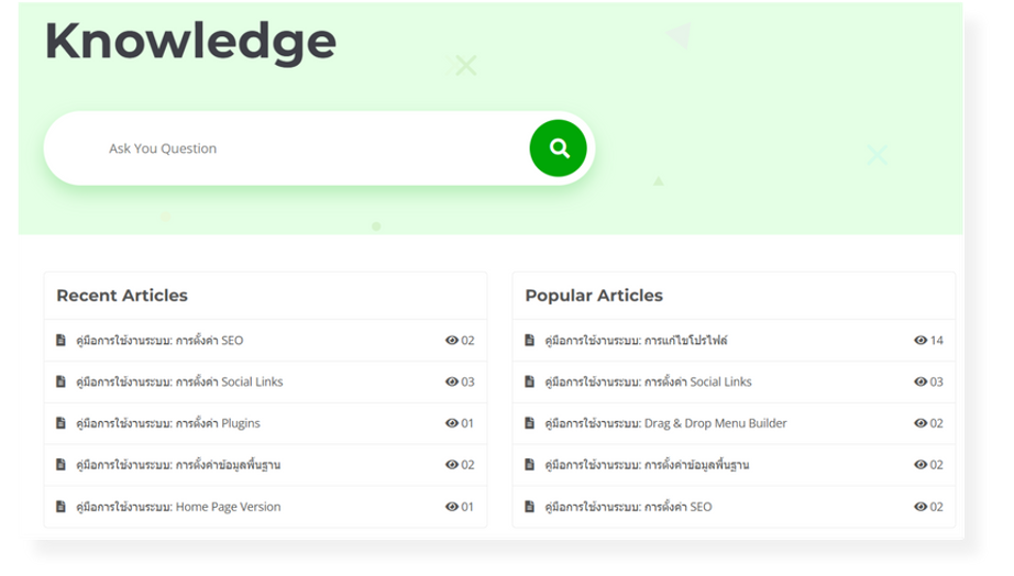 บทความความรู้แบ่งตามหมวดหมู่ ระบบจะแนะนำบทความอัตโนมัติในขณะที่กำลังสร้าง Ticket ช่วยลดปริมาณการส่งคำขอ ![]() | คำถามที่พบบ่อย (FAQs) คำถาม – ตอบแบ่งตามหมวดหมู่สำหรับการหาคำตอบเบื้องต้นด้วยตนเอง ![]() |